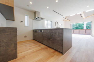 キッチンセットは定番のグラフテクトを採用し、同色のテーブルも設置して一体感を演出しました。