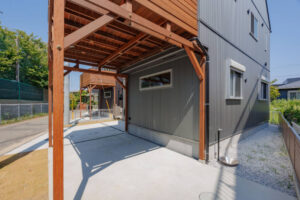 外壁は弊社基本スタイルのガルバリウム剛板ですが、 今回初採用の配色である『チタングレーメタリック』を採用。ウッドデッキとのカラー相性もグッドです。